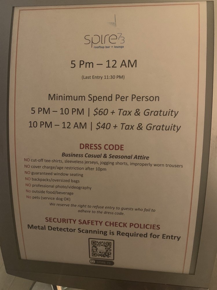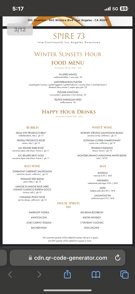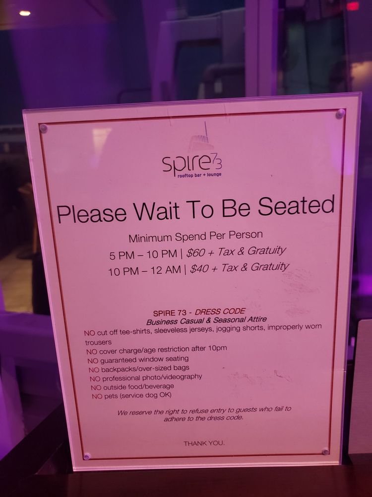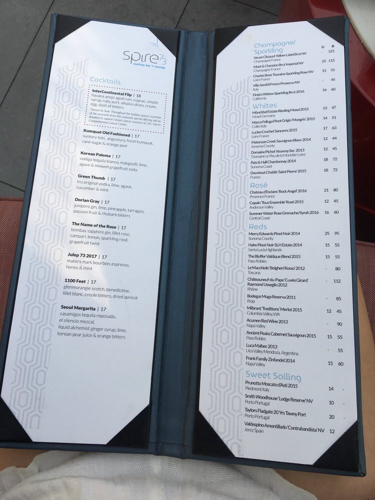 Spire 73 is a trendy and upscale rooftop bar located on the 73rd floor of the InterContinental Hotel in Los Angeles. Offering breathtaking views of the city, this venue is perfect for special occasions or casual gatherings. The menu features a variety of appetizers, entrees, and specialty cocktails. Notable dishes include the Filet Mignon, Grilled Ribeye, and Shrimp and Spaghetti. Customers have praised the excellent service provided by friendly staff and the cozy atmosphere created by fire pits and heaters. While prices may be on the higher side, the experience of watching the sunset over the city skyline is truly magical. Whether you're looking for a romantic date night or a fun evening with friends, Spire 73 is a must-visit destination.